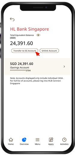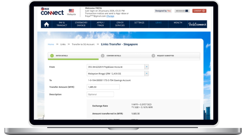 Transfer money seamlessly from HLB MY account to HL Bank SG account.