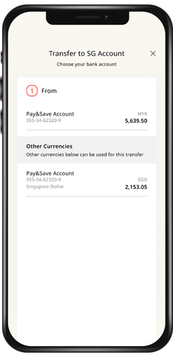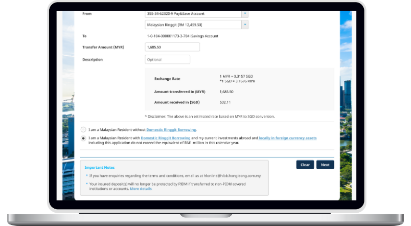 Transfer funds from your Malaysia bank account into your Singapore bank account easily.
