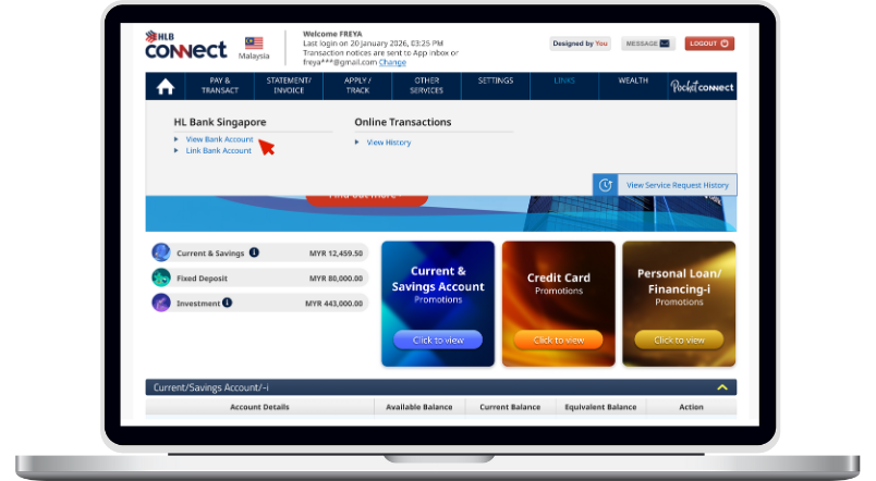 View your accounts and transactions across MY and SG on HLB Connect.